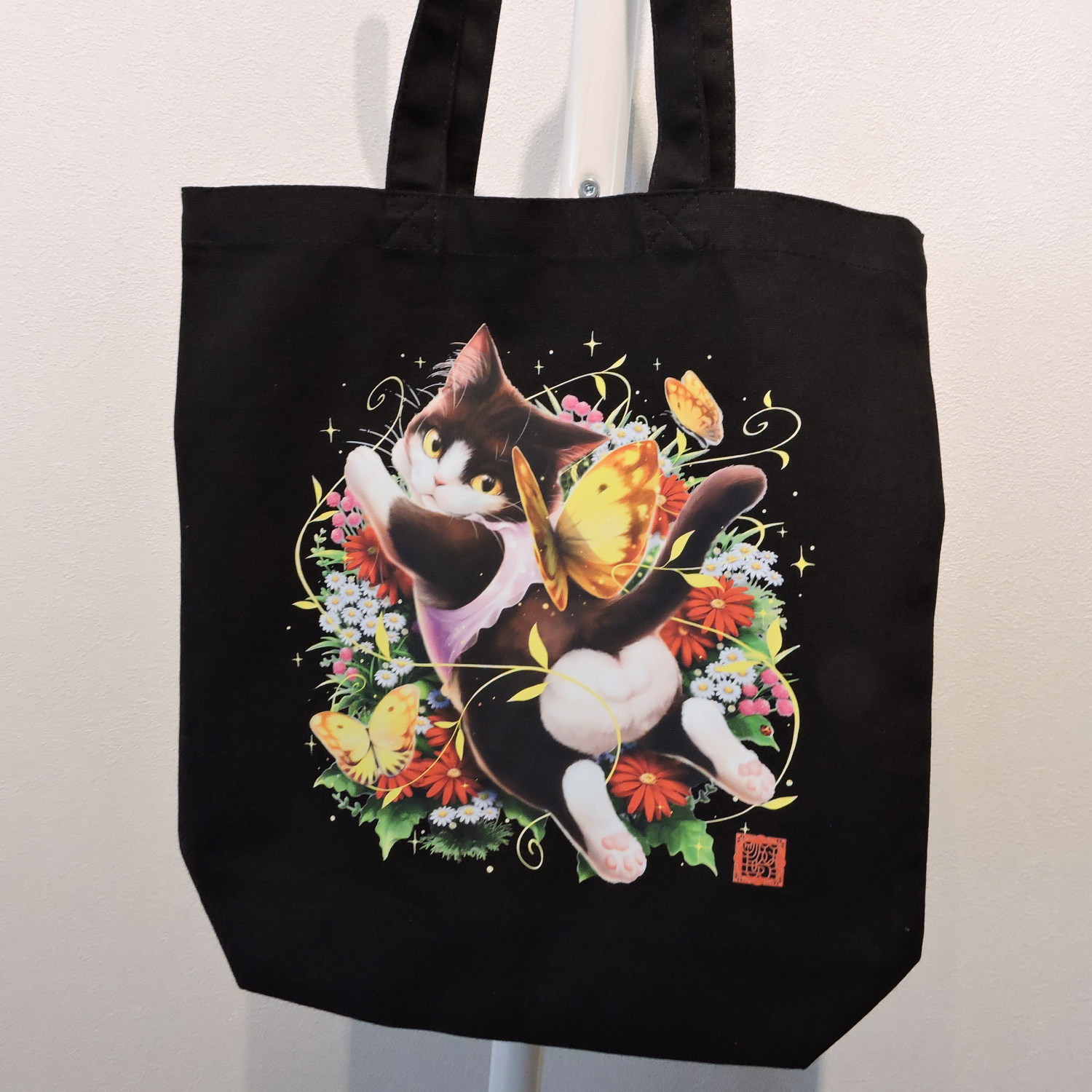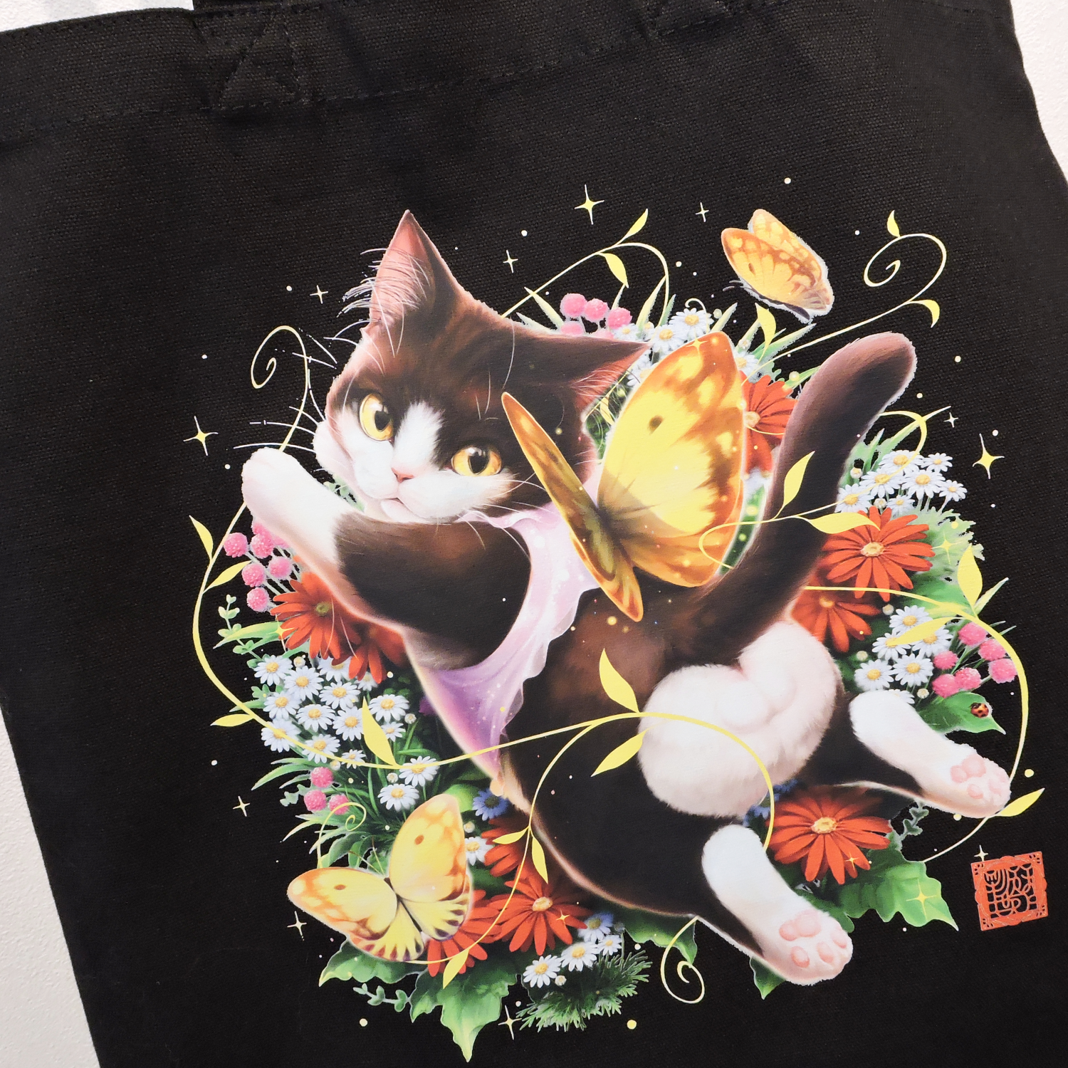 優雅な春の雰囲気を纏ったトートバッグが新登場!可愛らしいデザインが施されたこのバッグは、色とりどりの花々と愛らしい猫ちゃんが描かれており、持つことで心が弾むアイテムです。お洒落な春のコーディネートにもぴったりです!